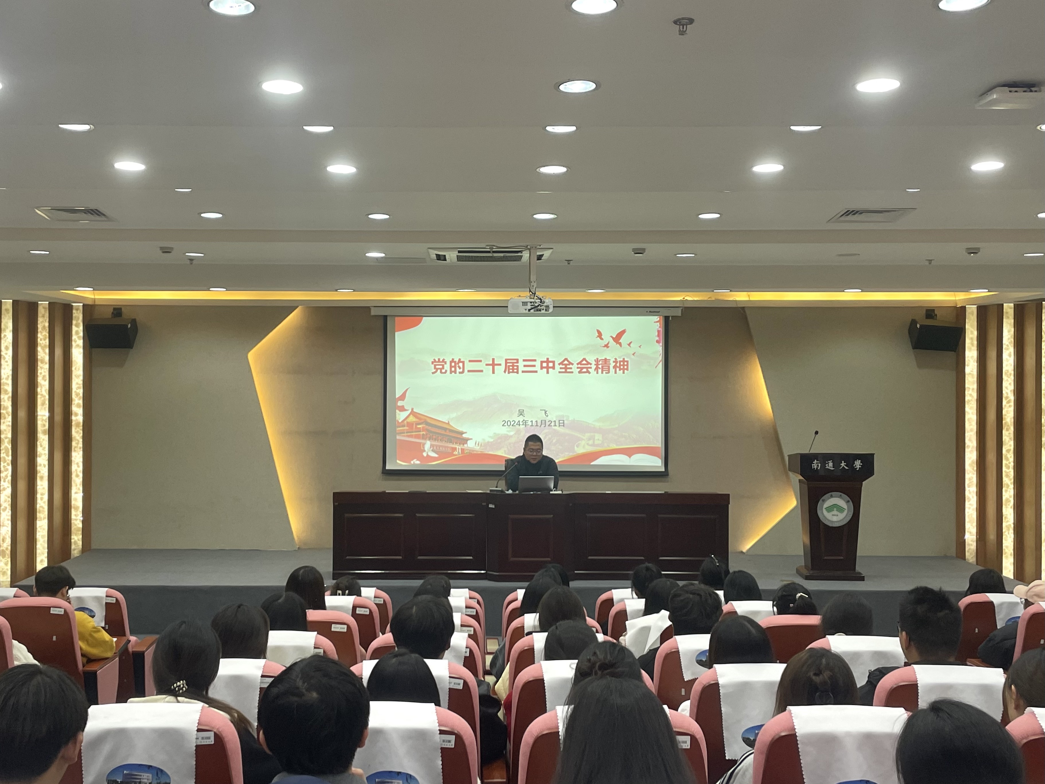 11月21日下午,经管学部菁英学社于图书馆报告厅开展了二十届三中全会精神宣讲会,由经管学部办公室(学工岗)副主任吴飞主讲,经管学部党总支副书记牟蕾,经管学部办公室(团委岗)副主任戎隽仪出席会议,菁英学社全体成员参会。