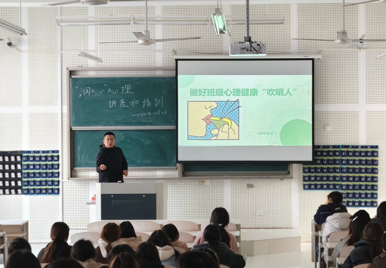 为深入推进经管学部心理健康教育工作,提升心理委员的专业素养和工作能力,12月6日,经管学部于JX3-4-308开展“润心”心理讲座和培训。本次讲座邀请经管学部办公室(学工岗)副主任吴飞主讲,24级全体心理委员及宿舍长参加培训。