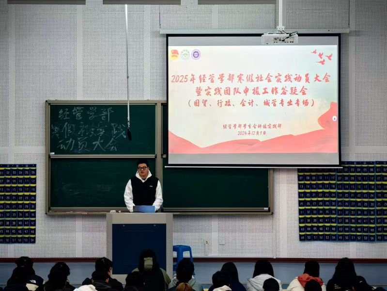 为提升学部学生的实践能力,培养具备社会洞察力、服务意识与实践能力的经管人才,12月9-10日,经管学部于JX7-8-102召开2025年寒假社会实践动员大会。经管学部办公室(团委岗)副主任戎隽仪出席会议,国贸222班沈弋涵主持会议,经管学部2024级全体学生参会。