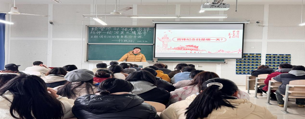 为深入学习雷锋精神与莫文隋精神的时代内涵,3月10日下午,行政241团支部于启东校区JX3-4-210教室举办“传承雷锋精神,续写莫文隋篇章”主题团日活动示范培训暨素养公开课,本次活动由行政241团支书周禹丞主持,行政241全体同学及经管学部大一、大二年级团支书参加。