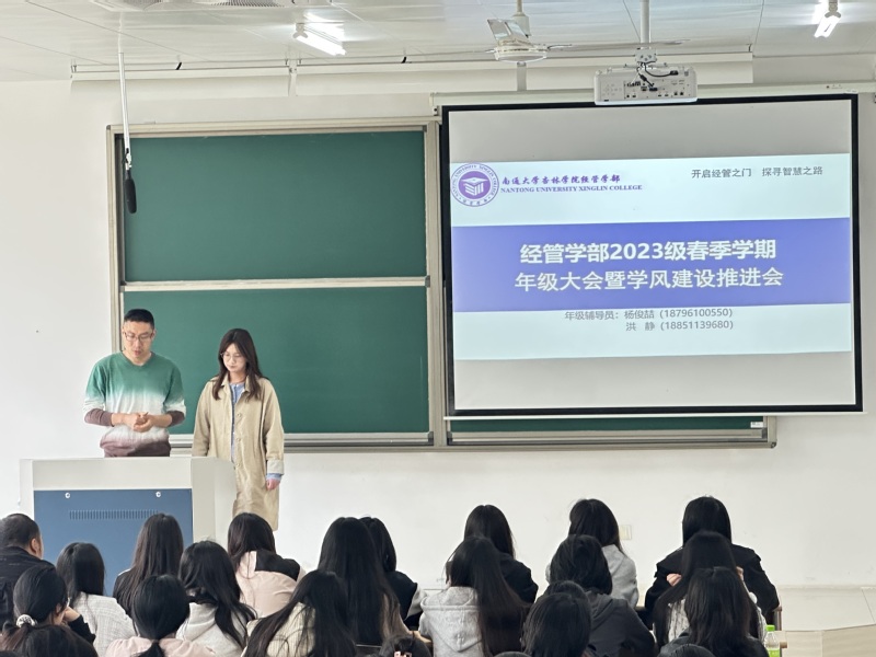 为进一步强化学风建设,营造积极向上的育人环境,经管学部于2025年4月24日在JX7-8-107召开2023级春季学期年级大会暨学风建设推进会。党支部副书记牟蕾、辅导员杨俊喆、洪静及经管学部2023级全体学生参会,会议由杨俊喆、洪静主持。