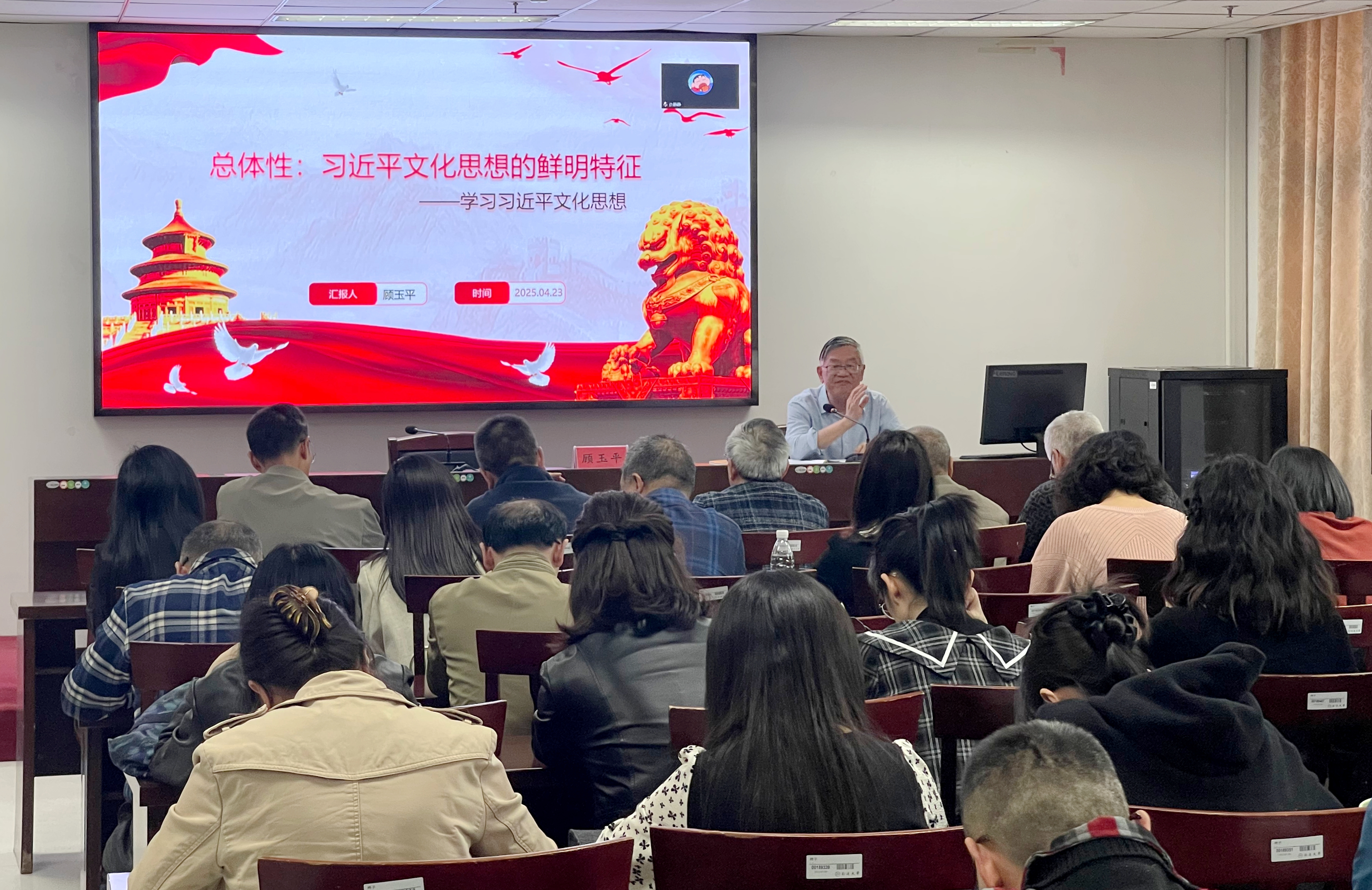 顾玉平教授以《总体性:习近平文化思想的鲜明特征》为题,从理论源头的追溯、文化传承的发展、文化强国的建设三个维度,梳理中华优秀传统文化的发展脉络,结合"两个结合"重要论述,系统阐释了总体视域下的习近平文化思想的鲜明特征与核心要义。顾教授强调:全党在深入贯彻中央八项规定精神学习教育,“八项规定”也是中国特色社会主义文化建设的重要内容。一是习近平总书记把作风问题与世界观、人生观、价值观联系贯通;二是习近平总书记把作风问题与党性联系起来,这都属于文化问题。“八项规定”及其细则不仅确立行为规范,更是深层次对党员干部文化底线和文明生态的再塑造。