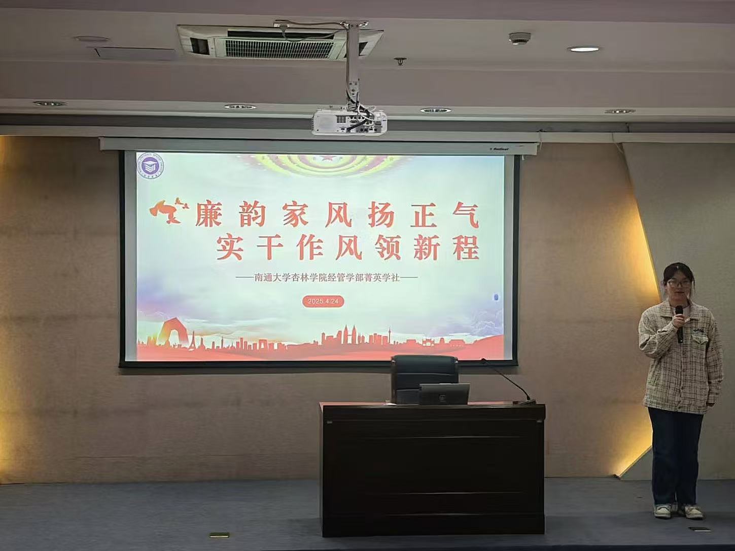 为深入贯彻两会精神,进一步加强廉政教育与作风建设,2025年4月24日下午,经管学部菁英学社于图书馆报告厅102开展了以“廉韵家风扬正气,实干作风领新程”为主题的理论学习活动。经管学部办公室(学工岗)副主任吴飞、经管学部辅导员王笛、经管学部辅导员高玉建,菁英学社全体成员出席本次活动。