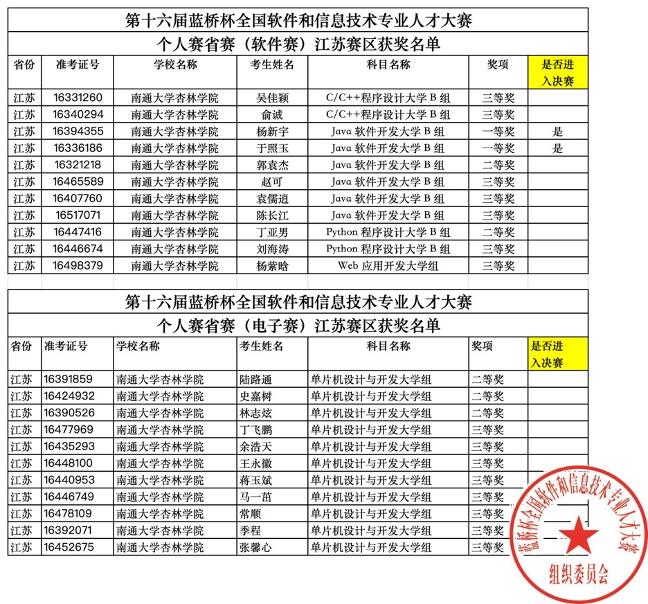 近日,第十六届“蓝桥杯”全国软件和信息技术专业人才大赛软件赛和电子赛省赛成绩揭晓。我院学子在竞赛中表现优异,共斩获一等奖2项、二等奖5项、三等奖15项,获奖总数创历史新高,其中软件赛获一等奖的杨新宇、于照玉两位同学成功晋级全国总决赛。