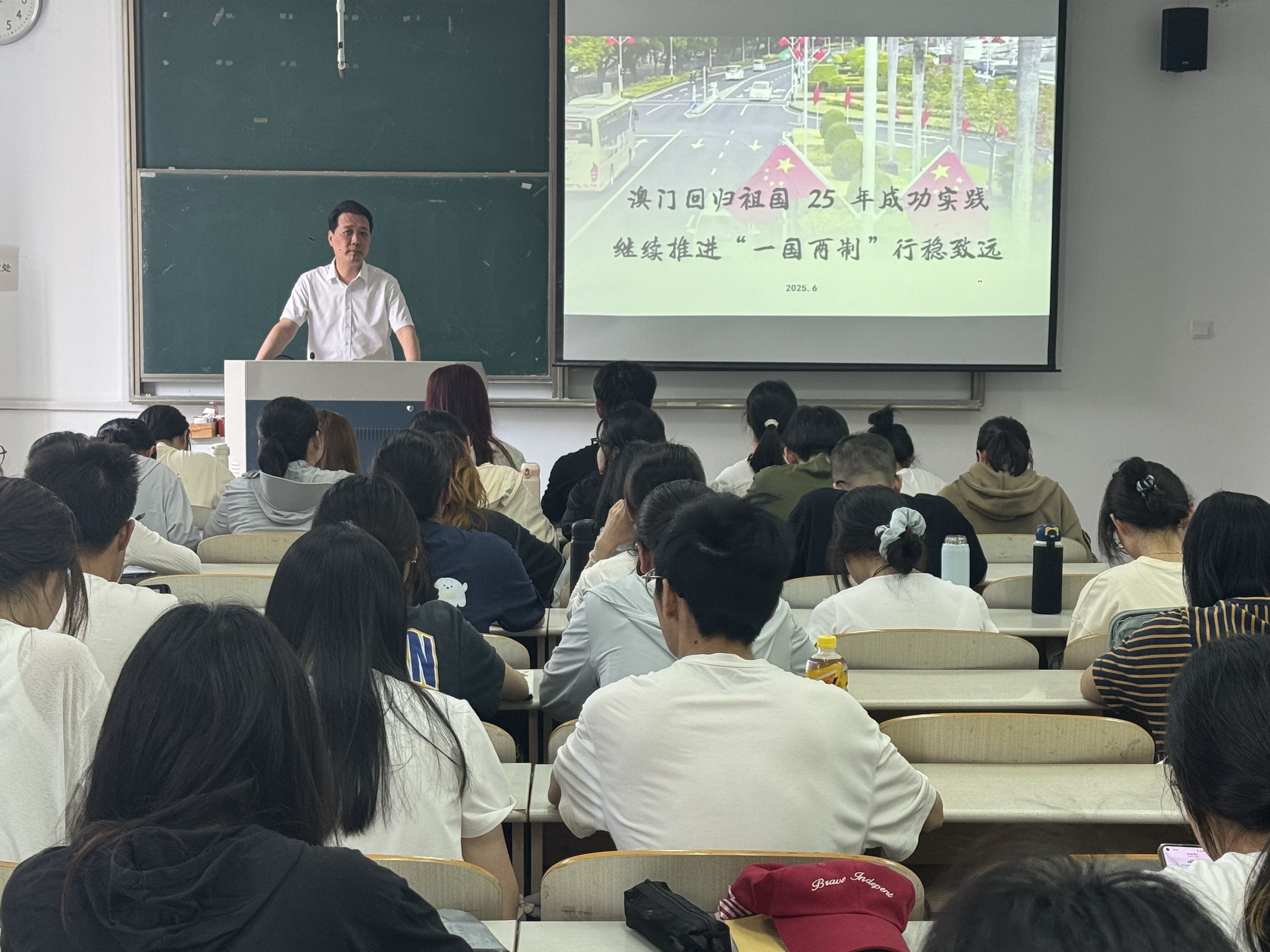 6月5日上午,金沙6165总站线路检测党委书记、启东校区管委会常务副主任朱晓阳为医学部学生带来一堂生动的《形势与政策》专题课。本次课程以“澳门回归祖国25年成功实践 继续推进'一国两制'行稳致远”为主题,通过深入浅出的政策解读、生动的案例分析和热烈互动的交流研讨,帮助学生准确把握国家发展大势,明确新时代青年的使命责任。