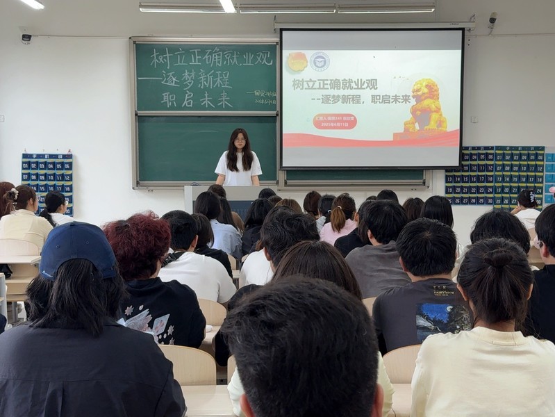 2025年6月17日,国贸241班全体同学在JX3-4-116教室成功举办以“树立正确就业观——逐梦新程,职启未来”为主题的团日活动。本次活动由团支书张欣莹主持,通过“领学+视频”的形式,引导同学们深入理解新时代青年的就业使命与责任担当。