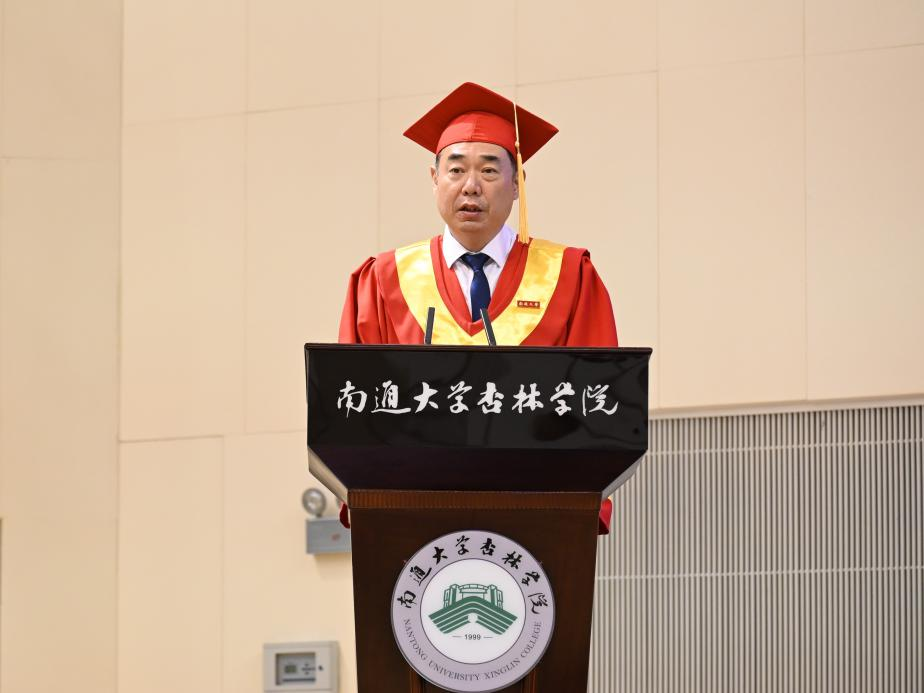 吉明明代表学校、学院理事会向所有毕业生表示热烈祝贺,并向悉心培养和关心学生成长的老师、家人致以诚挚的感谢。他回顾了近几年国家取得的历史性成就,学校实现的快速发展以及杏林学子创下的丰硕成绩。他对同学们提出三点希望:一是要守护心中理想之光,勇担时代赋予的使命,希望同学们永怀求真之志,坚守向善之心,胸怀家国之情,让理想之光照亮前行道路。二是要砥砺终身学习之志,拥抱未来无限的可能,要自我更新、终身学习、拥抱变化、把握机遇,在奔腾不息的时代洪流中勇立潮头。三是要激扬青春奋斗之姿,书写人生壮丽的篇章,脚踏实地,躬身笃行,让奋斗成为底色,让努力成为习惯,用智慧和汗水绘就独一无二的人生画卷。