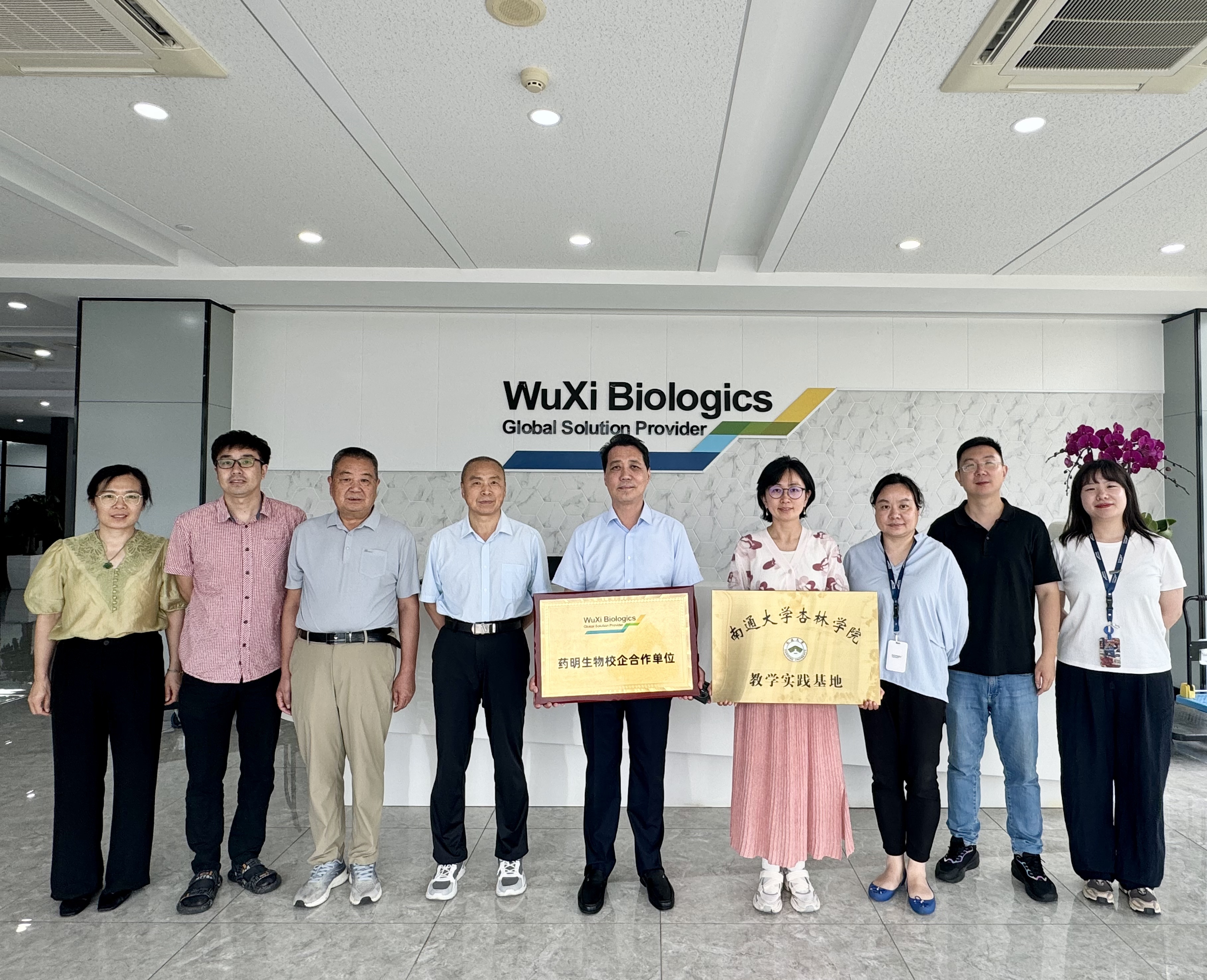 7月8日,金沙6165总站线路检测党委书记、启东校区管委会常务副主任朱晓阳率队赴无锡,与药明生物技术有限公司签署教学实践基地协议并举行挂牌仪式。药明生物人事经理陈亦婷、生产业务部负责人范永佳、学院副院长潘志勇参加活动。