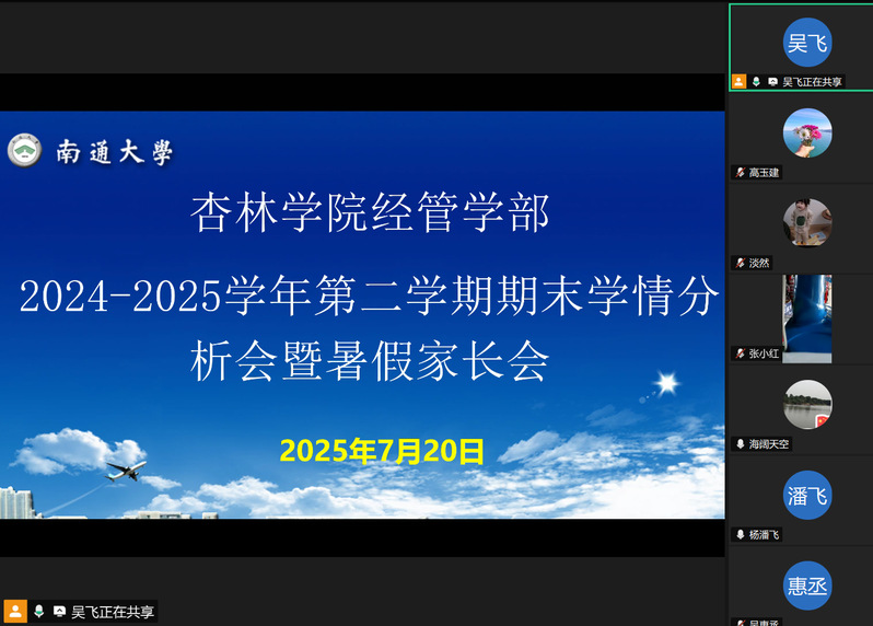 7月20日晚,经管学部通过腾讯会议召开2024-2025学年第二学期期末线上学情分析暨暑期家长会,学院学生工作处副处长彭本遵,学部党总支书记、学部主任钱亮华、学部副主任范赟、学部党总支副书记牟蕾、学部教研室主任、教学督导、学部全体辅导员以及不及格两门及以上课程学生家长参加会议。