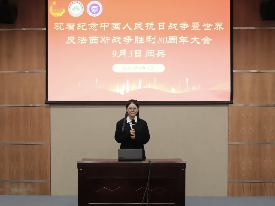 活动伊始,主持人纪柯旭介绍了抗战历史与中国战场的重要意义,强调了“铭记历史、缅怀先烈、珍爱和平、开创未来”的价值主线。随后,师生共同观看大会与阅兵,直观感受国家发展的强盛态势与军队现代化建设的卓越成就。