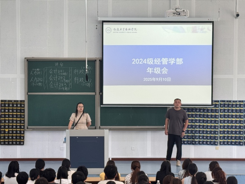 9月10日,经管学部2024级于第7-8-110教室召开新学期第一次年级大会。会议围绕年级组建设、学业发展、校园安全与日常管理四项核心内容展开,由辅导员戎隽仪、吴惠丞、张志伟主讲,2024级全体学生参加。