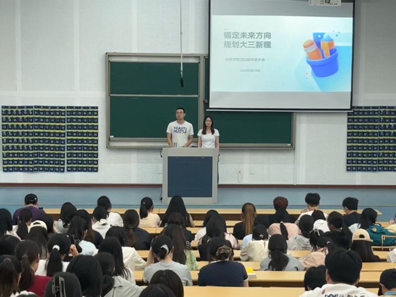 为帮助大三学子明确未来发展方向、科学规划学业生涯,进一步推动学部人才培养质量提升和高质量发展,9月10日下午,经管学部2023级于南通大学(启东校区)JX7-8-102教室召开“锚定未来方向,规划大三新程”主题年级大会。会议由年级辅导员杨俊喆、洪静共同主持,2023级全体学生参加。