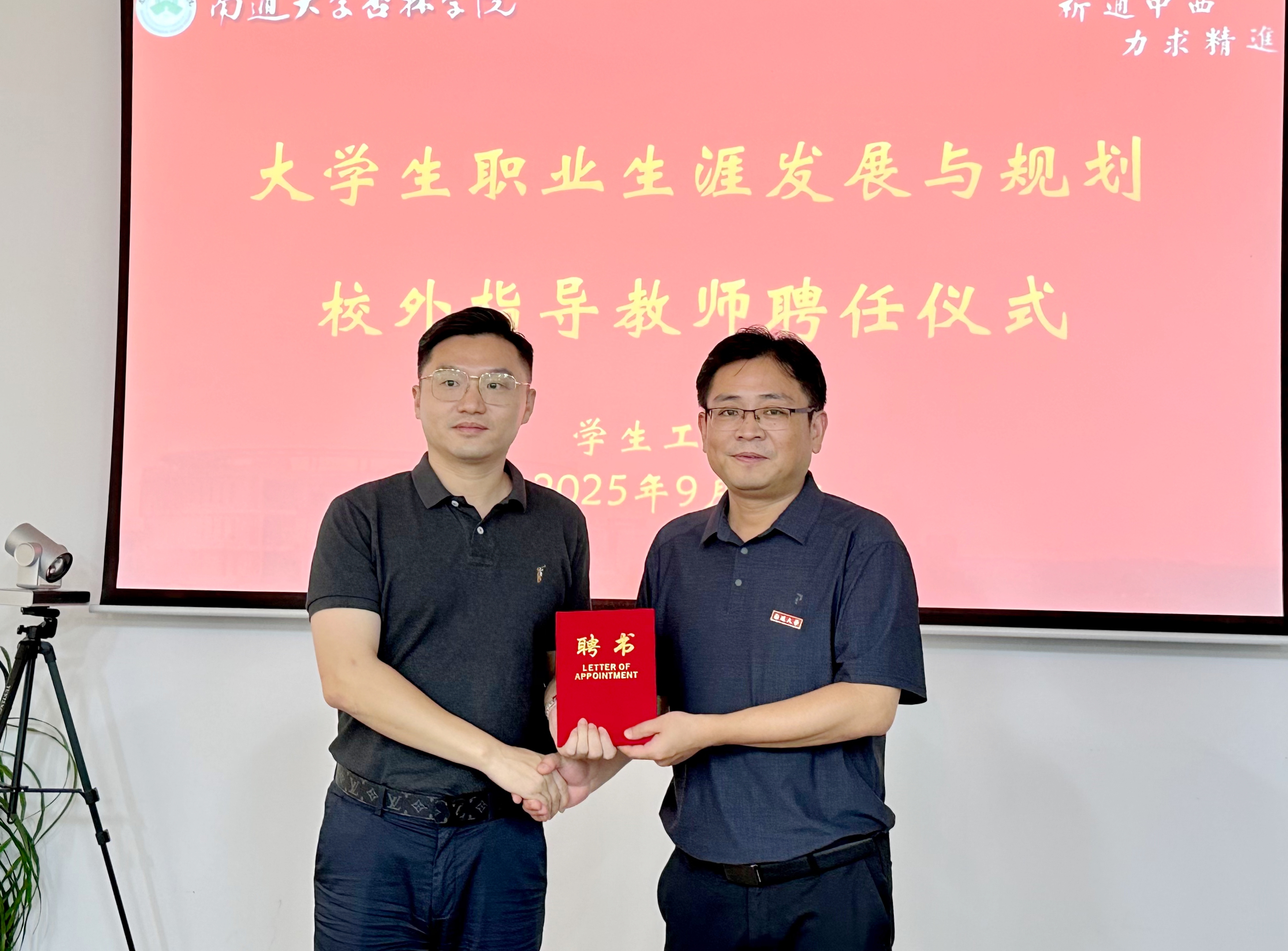 陈龙代表学院对朱益一行表示欢迎,并表示将以此为契机开展各项活动的深入交流与合作,大力推动访企拓岗促就业行动,有效提升我院毕业生就业质量。会上,陈龙向朱益颁发了聘书,聘任其为我院大学生职业生涯发展与规划校外指导教师。