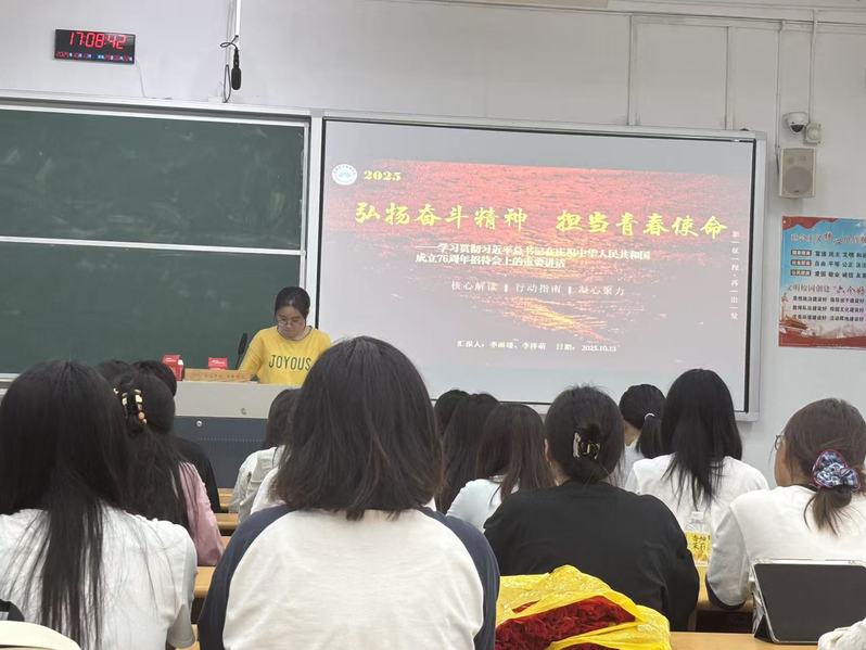 会议伊始,团总支副书记李泽萌同学以“习近平总书记庆祝中华人民共和国成立76周年招待会上的重要讲话”为引领,开展专题学习。她深入解读了讲话中关于国家发展、青年责任等核心内容,强调 “奋斗” 是青年成长的鲜明主线,“使命” 是时代赋予的历史担当,激励全体团学干部将个人理想融入国家发展大局,以青春之我、奋斗之我,为民族复兴和强国建设贡献力量。