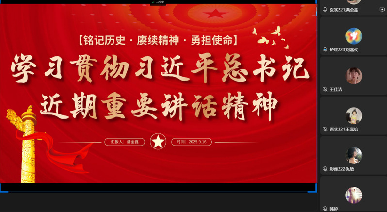 为深入学习贯彻习近平总书记重要讲话精神,医学部学生第二党支部于2025年9月16日开展“学习贯彻习近平总书记近期重要讲话精神”九月党课活动,党支部书记韩婷主讲,支部全体党员线上参加。
