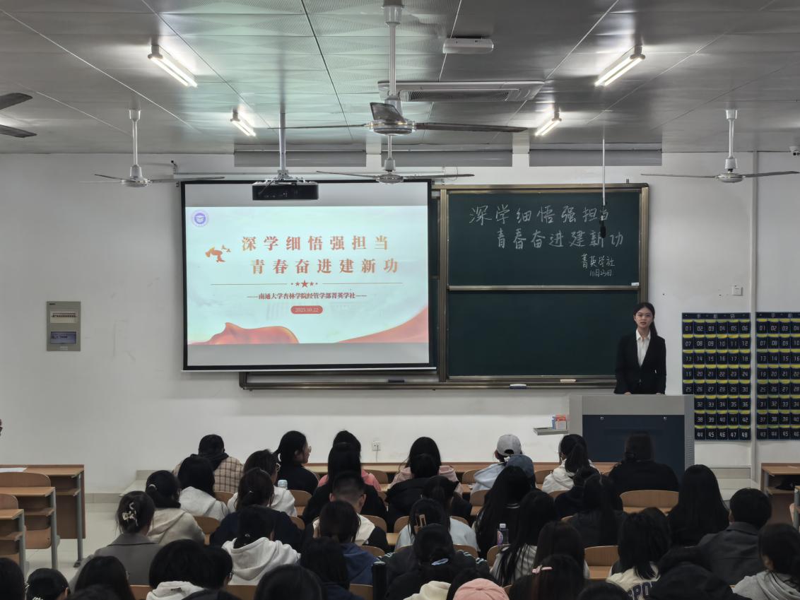 为深入学习贯彻习近平新时代中国特色社会主义思想,引导广大青年学子筑牢信仰根基、强化理论武装、勇担时代使命,2025年10月23日下午,经管学部学生党支部和菁英学社于JX1-2-102教室隆重举办了以“深学细悟强担当 青春奋进建新功”为主题的理论学习活动。学生支部党员与菁英学社全体成员共同参加。