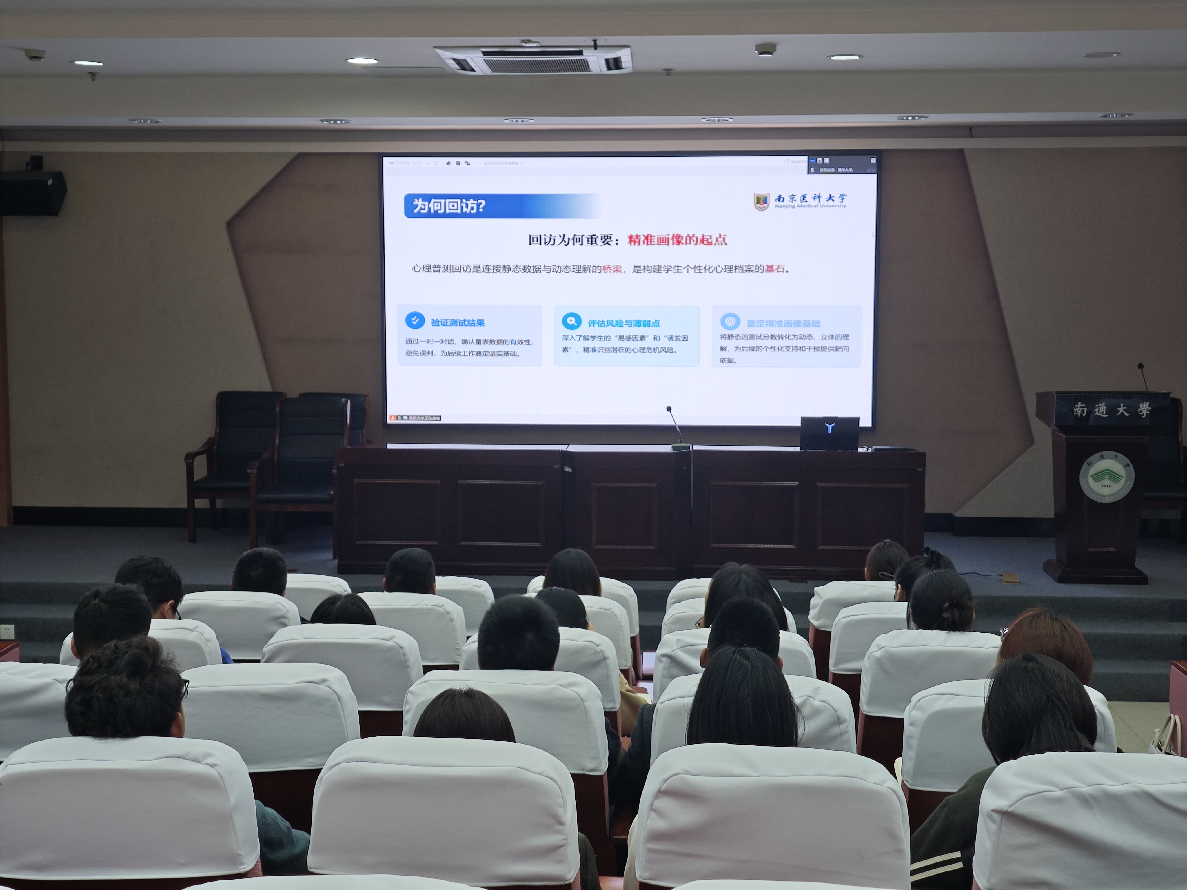 2025年10月29日下午,我院辅导员在图书馆102报告厅,集中参加了省教育厅统一部署、苏中基地举办的2025年新生心理普测后访谈工作专题培训。本次培训由南京医科大学工处何欢老师主讲。旨在破解辅导员访谈工作中目标不明、方法不规范、危机识别不足等痛点,推动新生心理普测结果向精准服务转化。