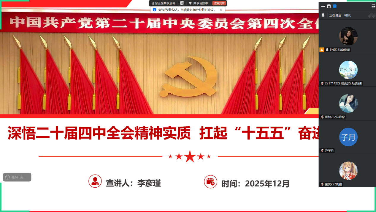 为深入学习贯彻习近平总书记重要讲话精神,医学部学生第二党支部于2025年12月9日开展“深悟二十届四中全会精神实质,扛起‘十五五’奋进新使命”十二月党课活动,党支部书记韩婷主讲,支部全体党员线上参与。