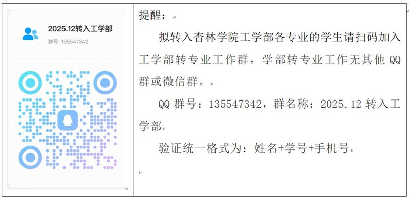 为方便申请人及时接收有关通知,请确保报名时留的手机号码准确无误并保持畅通。学部的组织考核的相关信息和通知在学部建立的“2025.12转入工学部”QQ群发布。所有参加考核学生及时加入QQ群。验证申请格式统一为:姓名+学号+手机号码,例:张三+2598765432+18912135678。